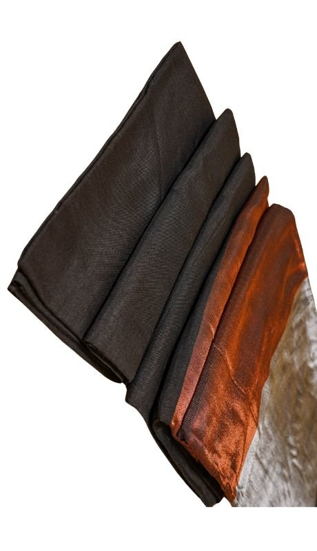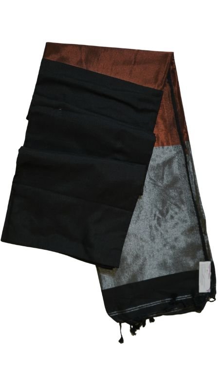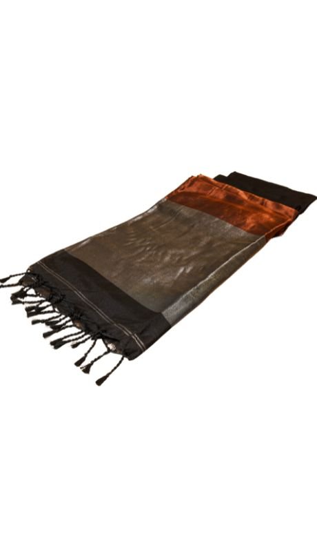 This elegant Khadi cotton saree in classic black features a stunning copper and silver pallu that adds a touch of glamour and sophistication. Perfect for festive occasions or evening events, this saree beautifully combines traditional craftsmanship with modern flair.