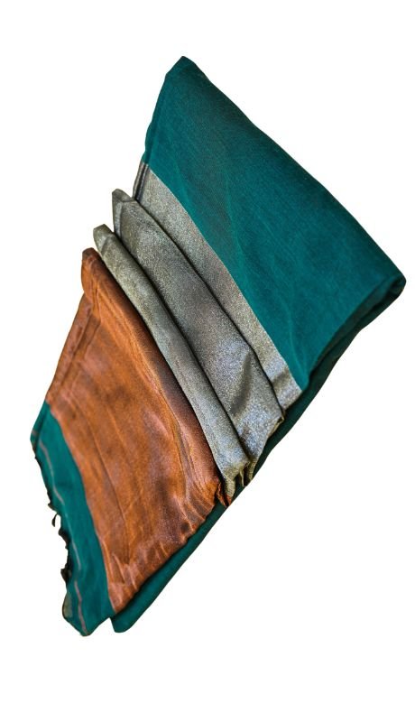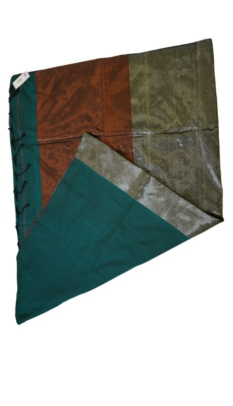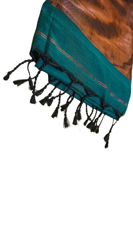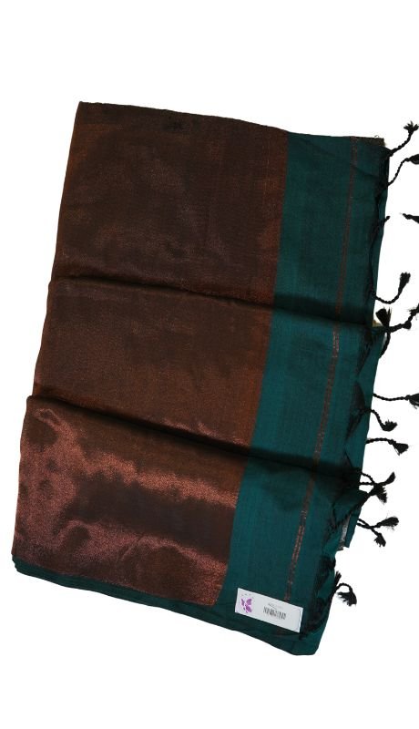 Elevate your style with our elegant khadi cotton saree in a rich brown hue, beautifully complemented by shimmering silver and copper borders. This tissue saree offers a subtle shine, adding a touch of glamour to your look. Perfect for both casual and festive occasions, drape it effortlessly for a sophisticated statement.