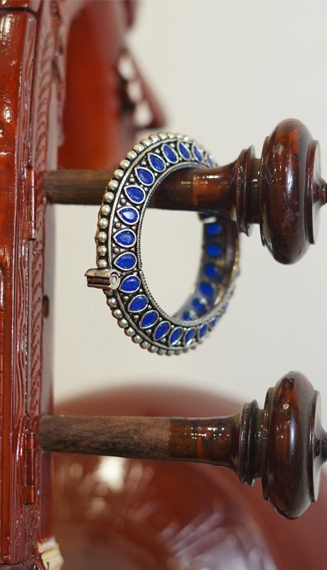 This thick, heavy oxidized bangle is a stunning piece of jewelry that exudes timeless charm and elegance. Crafted with meticulous attention to detail, it features beautiful blue stones set along the sides, creating a striking contrast against the rustic finish of the oxidized metal. The bangle’s substantial weight adds to its appeal, making it ideal for special occasions or adding a touch of grandeur to your everyday look. Whether paired with ethnic attire or used as a statement accessory with contemporary outfits, this bangle brings together traditional artistry and modern style in one exquisite piece.