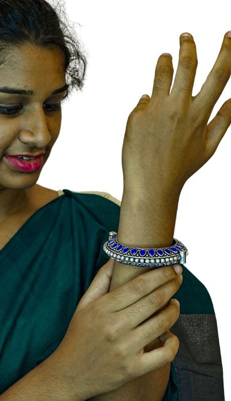 Make a bold statement with this thick, heavy oxidized bangle, adorned with beautiful blue stones on the sides. Its intricate design and stunning details add a touch of elegance to any outfit, perfect for those who appreciate traditional craftsmanship.