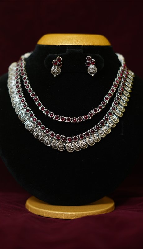 Introducing the Triya Ratna Kaasu Malai, a unique three-layer necklace that beautifully combines traditional and contemporary elements. The centerpiece is a classic kaasu malai, adorned with intricately designed oxidised silver-toned coins, exuding an aura of timeless heritage. The two upper layers consist of thin strands of red stones, adding a vibrant and elegant touch to the piece. Complemented by matching ear studs, this exquisite set is perfect for special occasions, festivals, or adding a touch of opulence to your traditional attire. Celebrate the blend of cultural charm and modern sophistication with this captivating jewellery set.