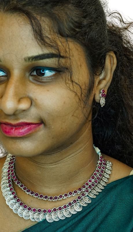 The Triya Ratna Kaasu Malai is a stunning three-layer necklace featuring a traditional kaasu malai and two delicate strands of red stone necklaces, accompanied by matching ear studs. A perfect fusion of elegance and tradition.