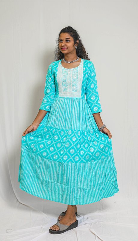 Elevate your ethnic wardrobe with our stunning kurti, featuring exquisite threadwork in the chest area that beautifully highlights your silhouette. Adorned with vibrant printed patterns throughout, this kurti strikes the perfect balance between traditional artistry and contemporary flair.